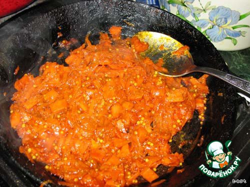 Тушим при средней температуре минут 10, пока морковка не станет мягкой. Добавляем томат, куркуму, горчицу, соль и перец и перемешиваем, тушим еще минуту. Перекладываем в миску, слегка остужаем.