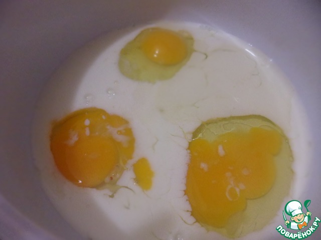 Три яйца разбиваем, добавляем к ним растительное масло, молоко и соль. Венчиком взбиваем до однородности, миллионы пузырьков нам не нужны.