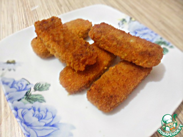 Сегодня в качестве начинки я взяла куриные палочки, проверенного мною неоднократно, производителя. В них точно больше мяса, чем в колбасных изделиях. Но частенько я и ими не гнушаюсь-беру молочные сосиски или копченые колбаски. Вобщем, сегодня палочки-предварительно слегка обжареные. Т. к. для моих формочек они оказались длинноваты, впоследствии они были порезаны пополам.