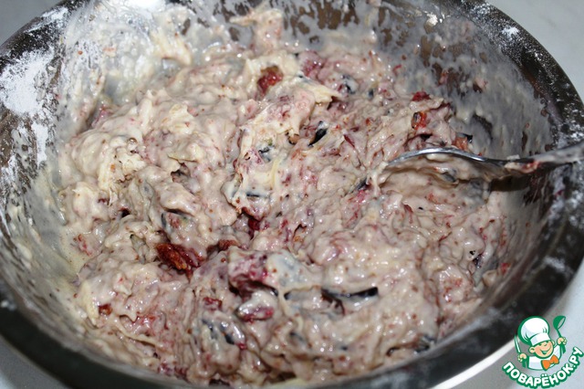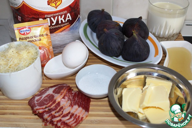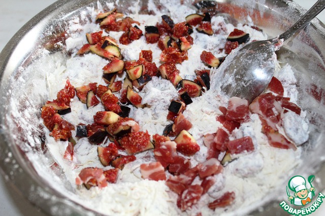 В чашке смешиваю муку, соль, разрыхлитель, тертый сыр, инжир, кусочки копченой грудинки.