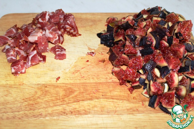 Нарезаю небольшими кубиками плоды инжира и копченую грудинку.