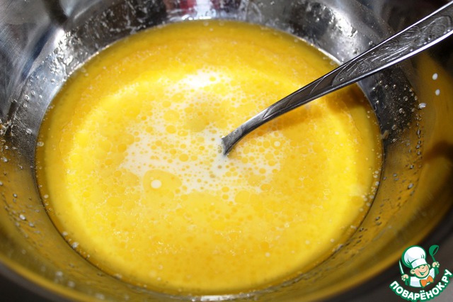 В другой чашке смешиваю теплое молоко, растопленное масло (не горячее), яйцо, мед.