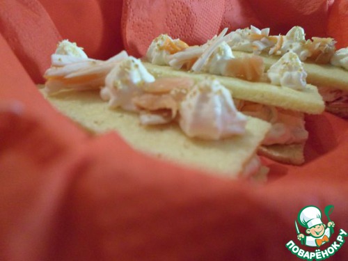Немного крема откладываем в кондитерский шприц, к остальному добавляем рыбу и крабовые палочки, солим и перчим по вкусу. (Я не солила, сёмга, на мой взгляд, сделала крем солёным в достаточной степени.) Перемешиваем ещё раз.