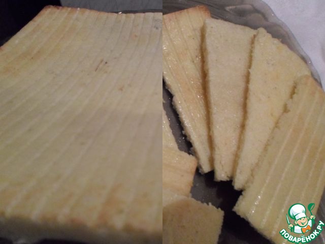Достаем бисквит из духовки, ждём, пока остынет до комнатной температуры, и разрезаем на 8 прямоугольников.
