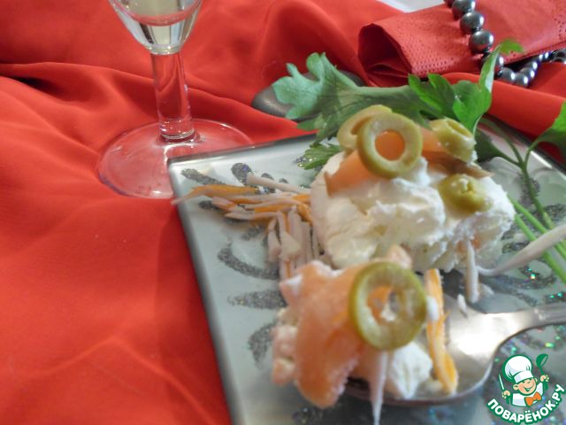 Не весь крем ушел на приготовление закуски, и осталось ещё достаточное количество непристроенного деликатеса. Но я не растерялась! Можно было бы доесть его и так, но это слишком просто! Вдохновленная интересным рецептом мороженого из сельди, я подумала, почему бы и не появится ещё одному сорту рыбно-крабового мороженого? Я добавила к крему взбитые сливки, специи, рыбку и крабовые палочки, и заморозила порционно. Теперь можно доставать его по мере надобности из морозильника, дать мороженому слегка подтаять, и наслаждаться кремом с бокалом любимого вина!