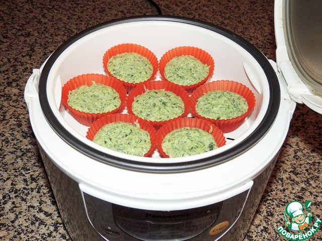 Распределить тесто по силиконовым формочкам для маффинов (получается 7 штук). Выпекать в духовке или на пару (у меня в мультиварке). В первом случае основа закуски будет более воздушной, во втором случае сохраняется более яркий цвет.