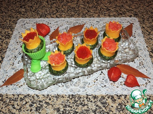 На каждый охлажденный шпинатный маффин положить по чайной ложке творожной начинки, обернуть сырной "короной". Сверху выложить икру или рыбку.