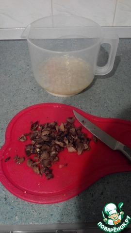 Смешиваем в миске стакан рассола, примерно половину стакана растительного масла, жареный лук и грибы. Лук можно не пассеровать, а положить сырым. Такой лук всегда дает в тесте некую остроту, но не запах.