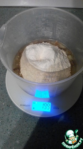 После добавляем 200гр муки и чайную ложку разрыхлителя. Все хорошо перемешиваем в однородную массу. Тесто должно получиться не жидким. Если жидковато, то добавьте еще муки. На этом этапе можно добавить соль и сахар, если ваш рассол на вкус кислый или наоборот недостаточно соленый.