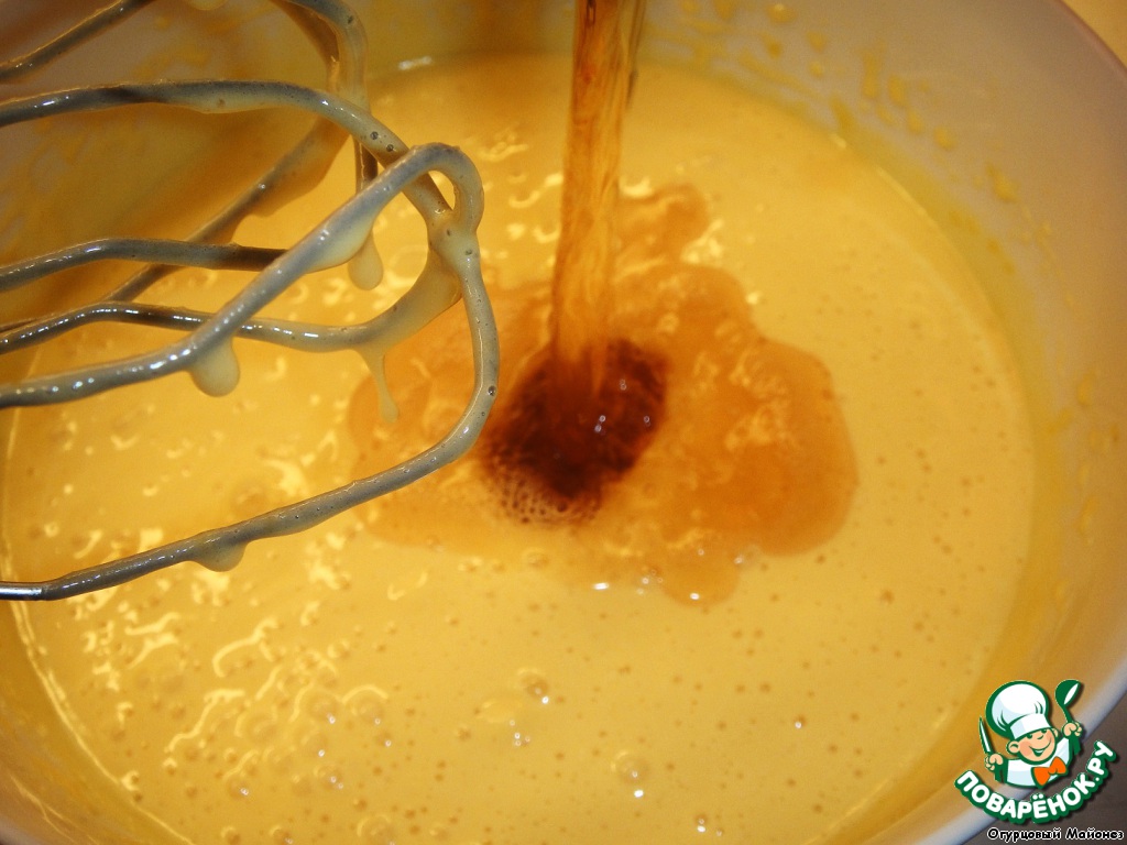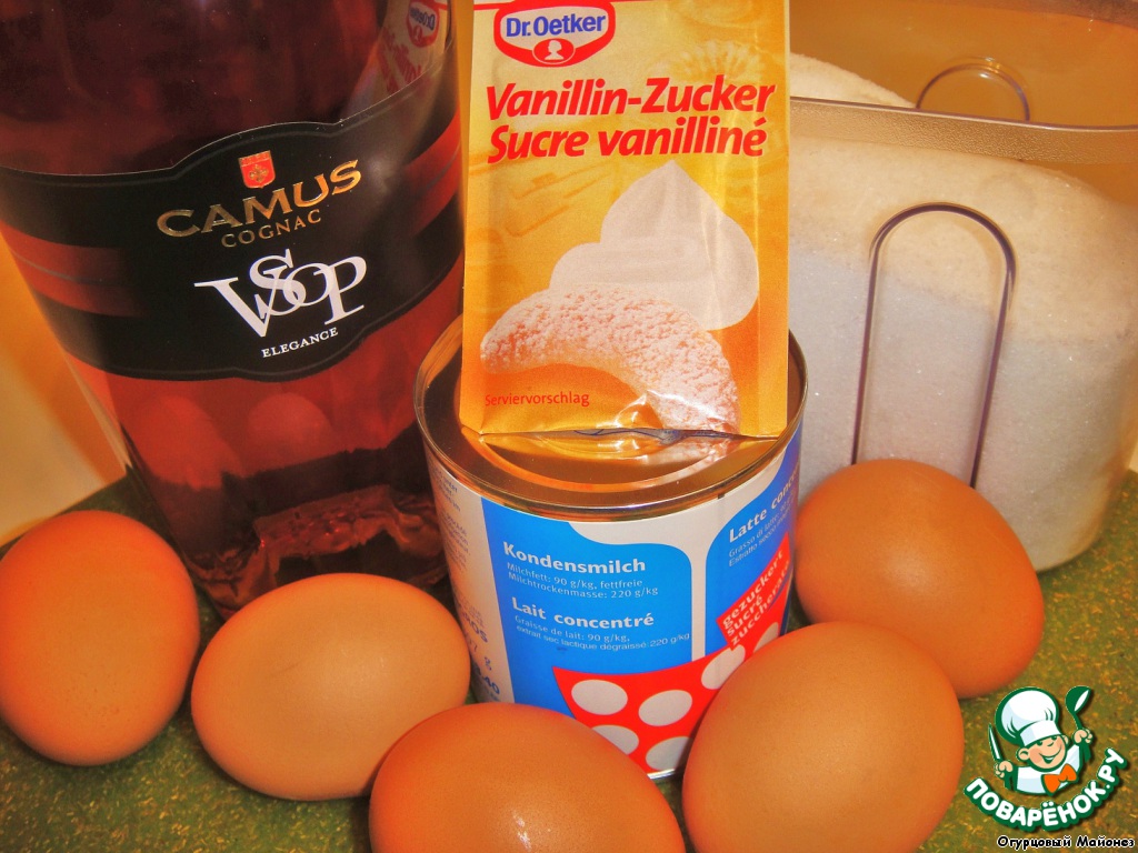 Отмеряем нужный объём коньяка (излишки отпиваем). Вливаем коньяк в яичную массу.