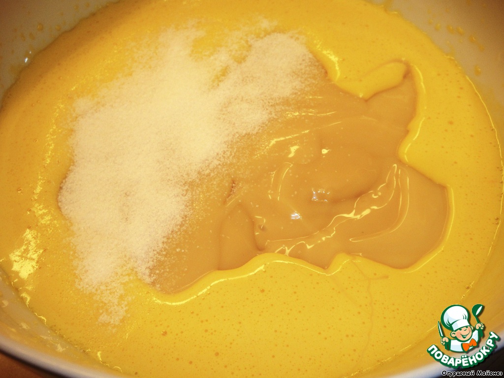 Как только масса немного посветлела, добавляем сгущёнку и ванильный сахар.