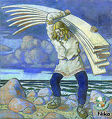 Иллюстрация к «Калевипоэгу» Оскара Каллиса. Калевипоэг (сын Калева) в эстонской мифологии богатырь-великан, сын богатыря Калева, а также эстонский героический эпос о нём. Первоначальный образ Калевипоэга — великан, с деятельностью которого связывались особенности географического рельефа: скопления камней, набросанных Калевипоэгом; равнины — места, где Калевипоэг скосил лес, гряды холмов — следы его пахоты, озёра — его колодцы, древние городища — ложа Калевипоэга и т. п. Калевипоэг также борец с нечистой силой, с притеснителями народа и с иноземными врагами.