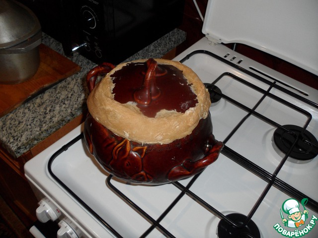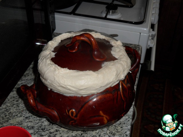 Добавляем подогретый мед. Из муки и воды замесим крутое тесто, дать ему полежать под полотенцем 1-2 ч. Плотно закрываем чугунок лепешкой из теста, облепляя горлышко. Наша задача - не выпустить наружу жидкости. У нашего горшка слишком широкое горлышко. Поэтому залепили вот так. В книге крышка полностью из теста.