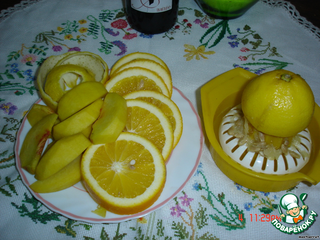 Персик очищаем, апельсин нарезаем с цедрой, с лимона срезаем цедру и выжимаем сок