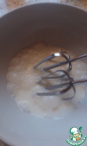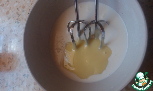Через пару минут добавляем сгущенку, снова взбиваем.