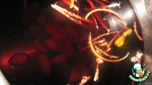 Оставшееся вино разогреть до 60 градусов, влить туда приготовленный экстракт и добавить изюм, миндаль,