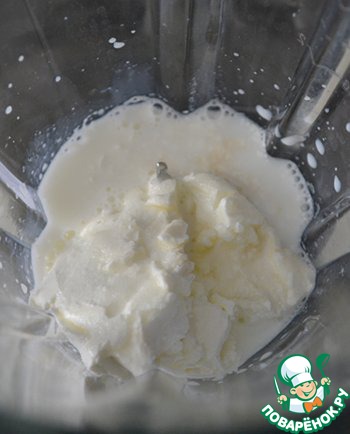 В блендер поместить крим-чиз (сливочный сыр), молоко, 3 ч. л. сахара, ванилин.