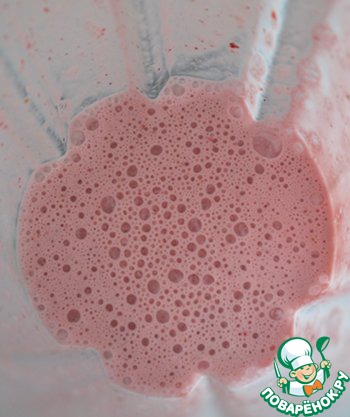 Продолжить взбивание до однородной массы. Клубника должна быть полностью измельчена, масса должна окраситься в нежно-розовый цвет.