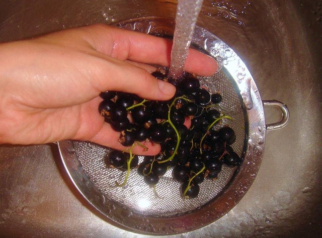 Тем временем займёмся ягодами. Чёрную смородину промываем.