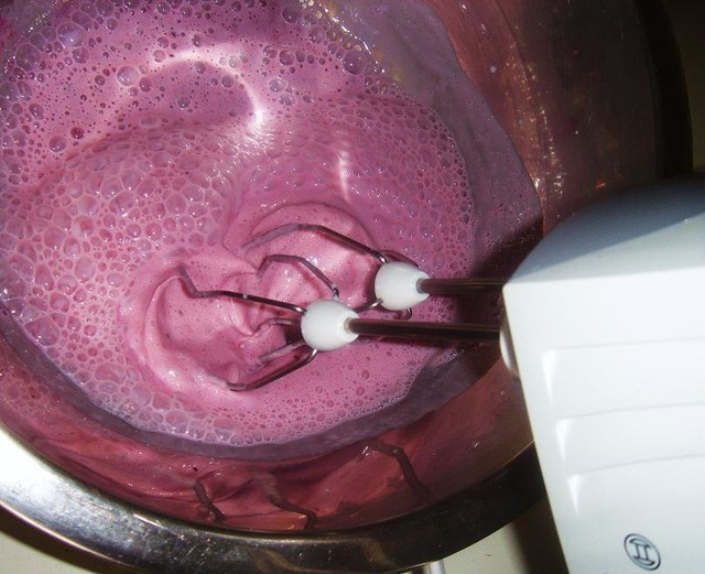 Теперь медленно вливаем молоко в посуду с ягодным пюре. И одновременно начинаем всё очень быстро размешивать, чтобы молоко не свернулось. Лучше на этом шаге использовать миксер.
