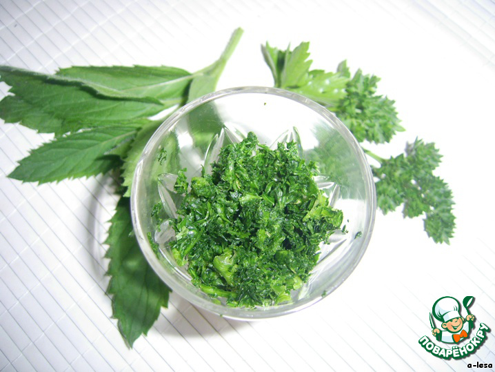 Измельчить зелень любым удобным для Вас способом (блендер, измельчитель, чеснокодавка).