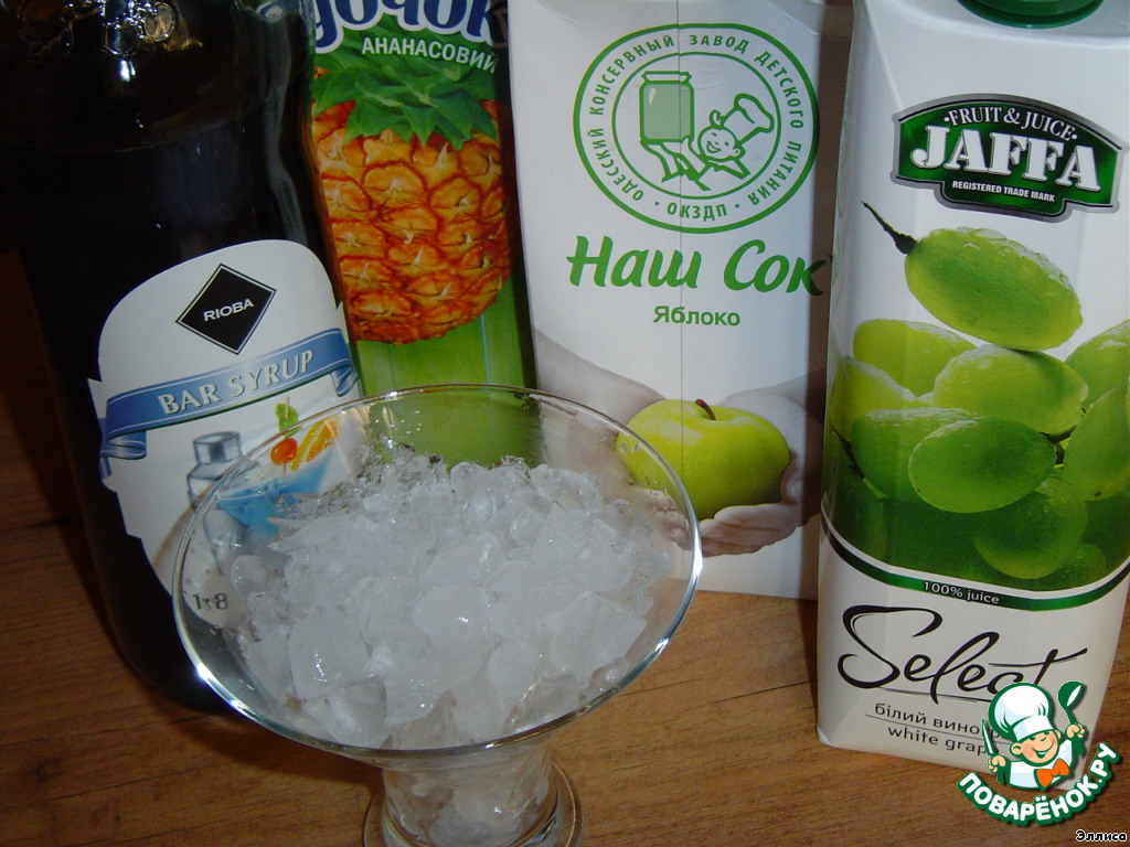 Все соки и сироп смешиваем в шейкере, или в стакане для смешивания коктейлей. Бокал наполняем льдом и в него наливаем коктейль.