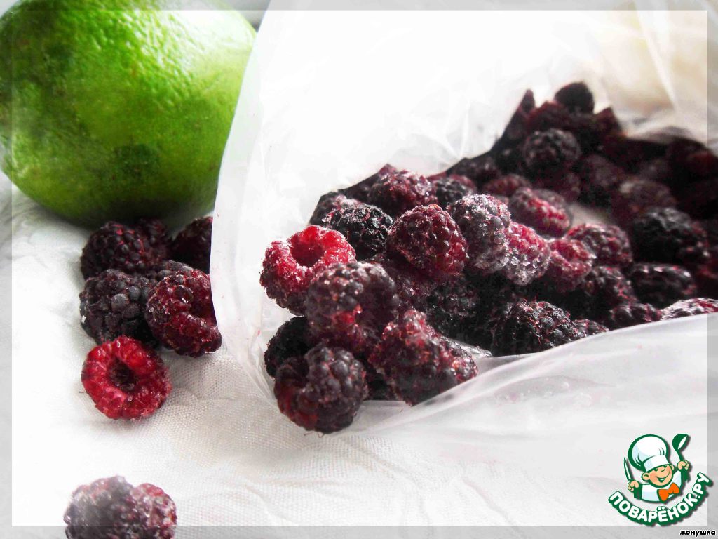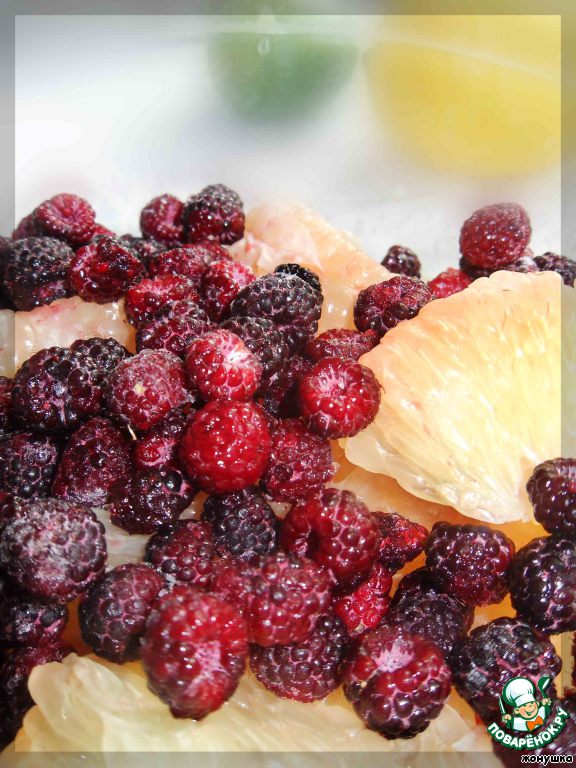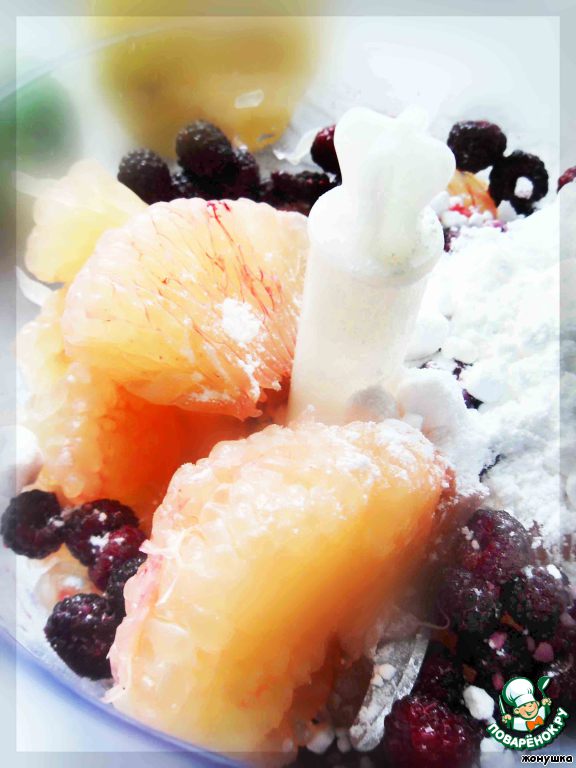 Мякоть грейпфрута перемешиваете вместе с ежевикой, сахарной пудрой и лимоном.