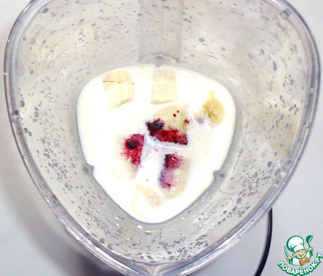 Остальные части бананов, которые побольше, очищаем, нарезаем на кусочки, складываем в блендер, добавляем черничное варенье или чернику, йогурт, апельсиновый сок.