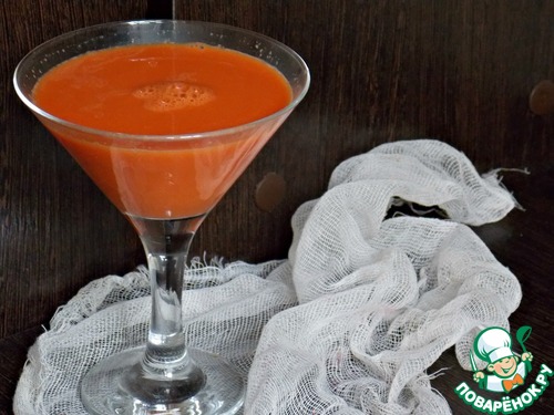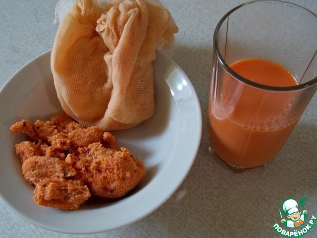 Затем при помощи марли, сложенной в несколько слоев и наших ручек выжимаем сок. Конечно при наличие соковыжималки этот процесс был бы быстрее. Выливаем свежевыжатый сок в бокал, а жмых в тарелку.