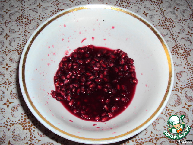 Для начала приготовим гранатовый лёд: зёрна граната положить в глубокую керамическую чашку, добавить по щепотке корицы и ванилина.