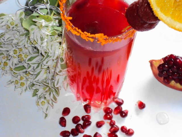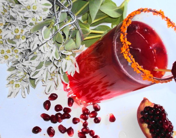 Теперь осторожно опустите в бокал несколько кусочков гранатово-корично-ванильного льда и не перемешивайте. При таянии льда будут образовываться потрясающие пурпурные "сполохи восхода солнца"! Этот коктейль не только божественно красив, но и невероятно вкусен и очень полезен!