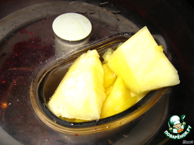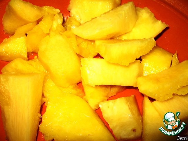 Из ананаса вырезать жёсткую серединку. Порезать на кусочки мякоть.