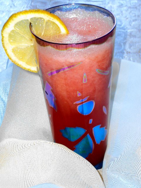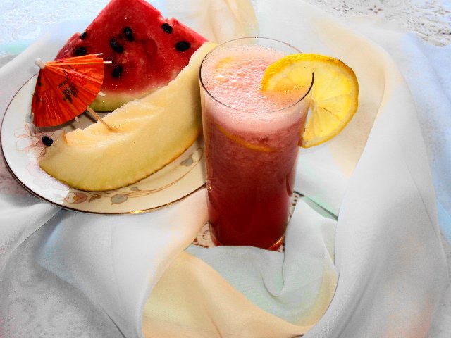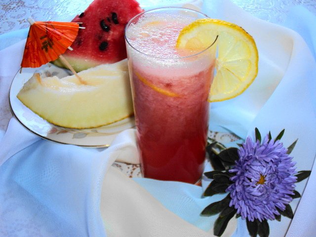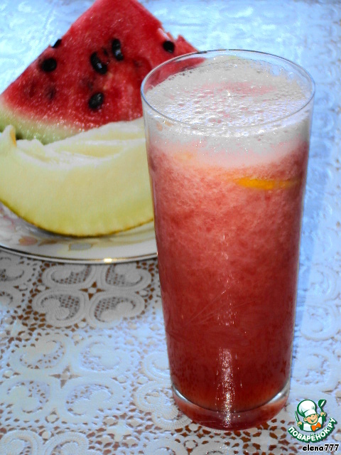 | Необычный, тонизирующий арбузно-дынный коктейль с тонким ароматом лимона, мeда и базилика приятно освежает и утоляет жажду. На конкурс "Утомленные солнцем" |