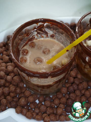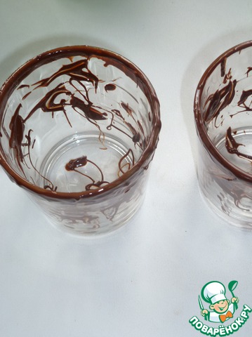 Шоколад растопить в микроволновке. Кромку бокала и изнутри облить растопленным шоколадом.