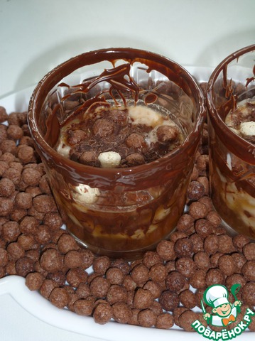 Налить в бокал чай, затем взбитые сливки с бананом. Посыпать тертым шоколадом и шоколадными шариками.