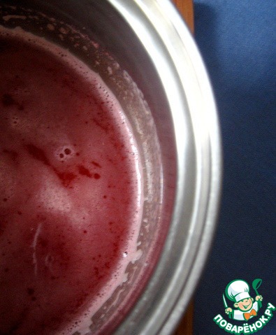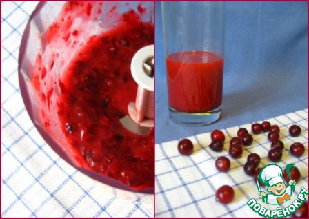 Теперь приготовим клюквенный сок. Измельчим клюкву с помощью блендера и процедим сок через марлю или мелкое ситечко. Его (сока) нам нужно тоже 70мл.