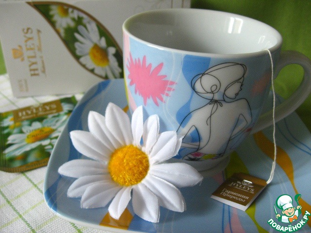 Выливаем в чашку наш горячий коктейль из соков. И опускаем туда пакетик зеленого чая Hyleys/Хэйлис с ромашкой.
