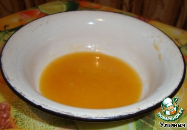 В охлаждённый кисель добавить сок персика и апельсина. Всё хорошенько перемешать.
