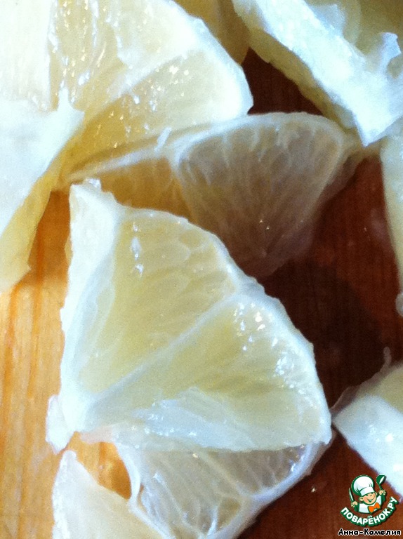 Лимон очищаем от цедры и косточек, чтобы не было излишней горечи... Режем кольцами, а кольца - на четвертинки.