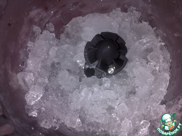 Приготовить кусочки льда. Холодную воду заливаем в кулёчки для льда и кладём в морозилку для заморозки. Затем с помощью блендера измельчаем лёд.