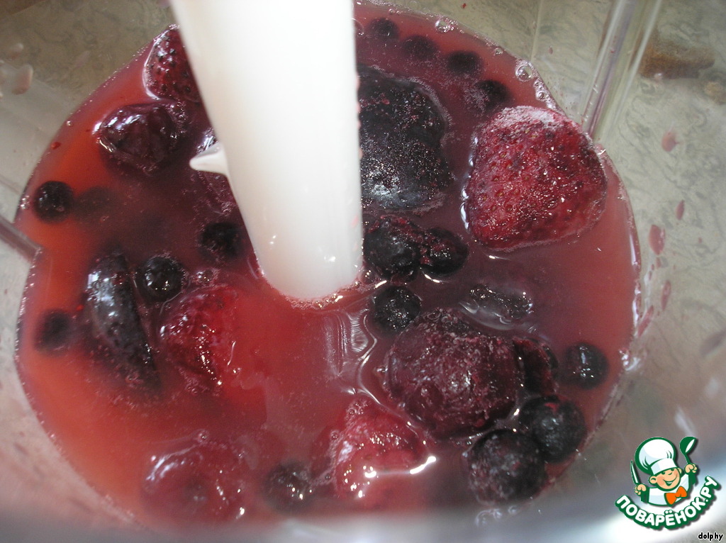 В чашу блендра поместите все ингредиенты: смесь замороженных фруктов и ягод (у меня клубника, слива, черная смородина и вишня) и соки.