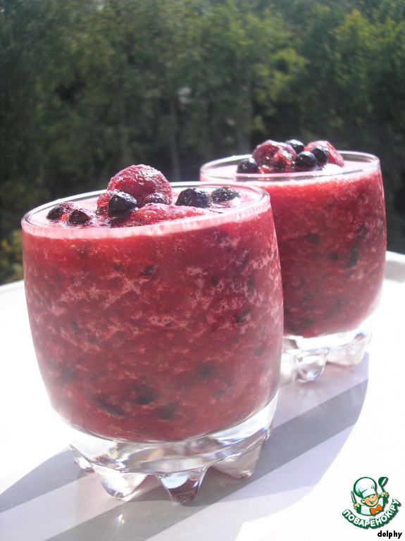 Разлейте по охлажденным стаканам. Украсьте ягодами или кусочками фруктов.