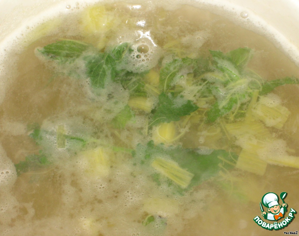 Добавьте несколько веточек свежей мяты (у меня 3-4 небольших веточки) и крупную веточку мелиссы (это не обязательно, но она дает интересный лимонный оттенок).