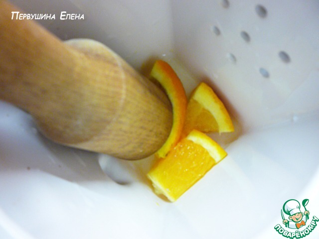 Апельсин тщательно вымыть. Порезать произвольными дольками и вместе с кожурой опустить в большой чайник.