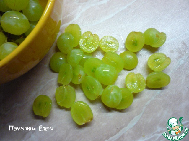 Разрезать пополам ягоды винограда и добавить их к апельсину с сахаром.