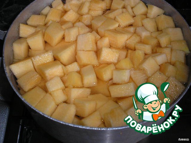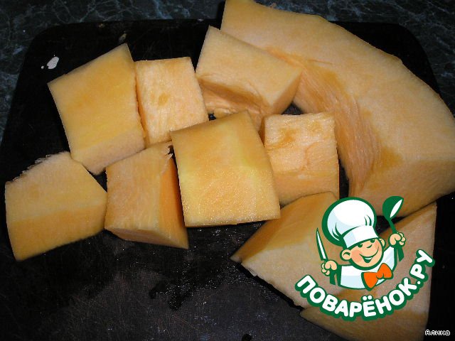 Тыкву моем, чистим от кожуры и семян. Затем нарезаем кусочками, чтобы можно было уложить в кастрюлю, где будем готовить компот и определится с количеством воды.