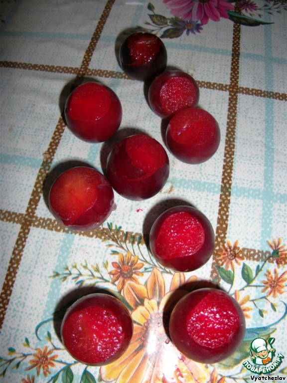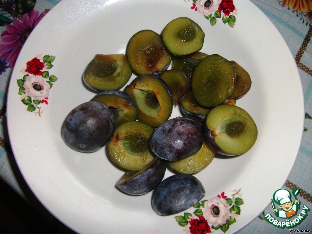 С десяток слив (лучше ещё недозрелых) разрезаем пополам и вынимаем косточки.