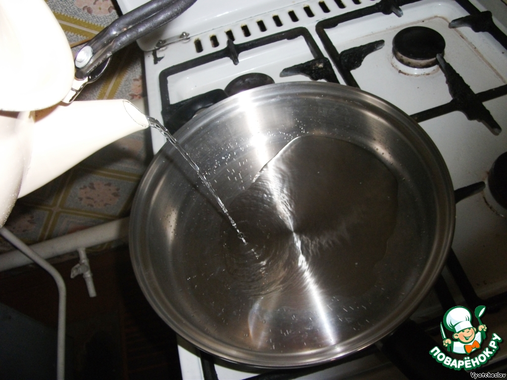 Ставим на огонь большой сотейник и наливаем столько воды, чтобы она только покрыла дно.