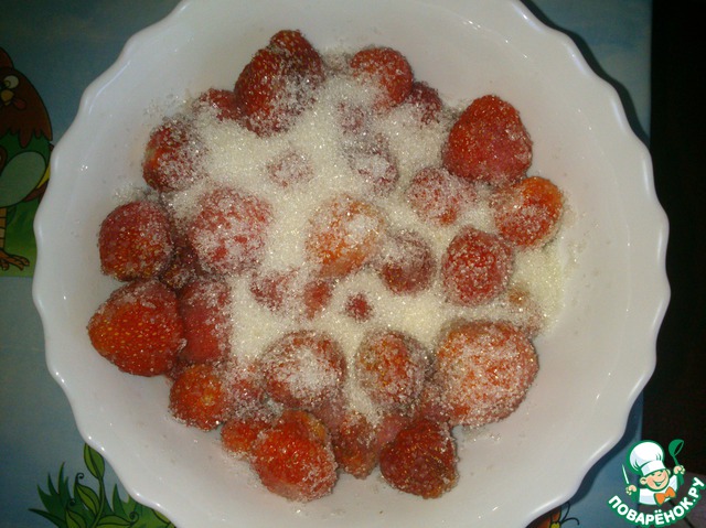 Ягоды засыпать сахарным песком и поставить в прохладное место. Пусть постоят около часа, чтобы вышел сок.