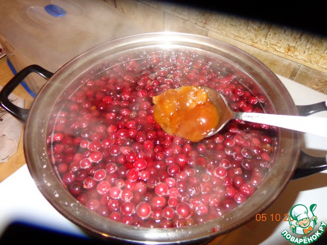 Добавляем сахар и мед, пробуем на вкус, клюква - ягода кисло-горьковатая, поэтому подгоняем по своему вкусу.